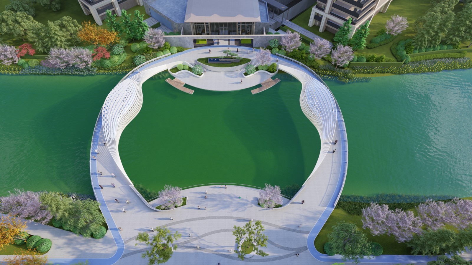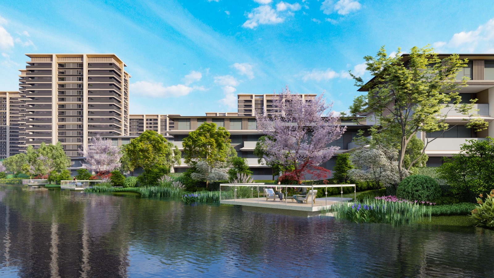 悅達(dá)·海玥府秉承品質(zhì)生活運(yùn)營家的發(fā)展理念,利用1公里長的地龍河黃金河岸線,形成天然的河灣半島地貌。整個項(xiàng)目采用現(xiàn)代中式風(fēng)格建筑造型,融入西式生活流線理念,營造空間豐富的花園體系,保證了每戶的通風(fēng)、采光以及景觀效果。同時將多景的園林表現(xiàn)手法,巧妙運(yùn)用到住宅園林景觀設(shè)計(jì)之中,營造一種恢弘大氣,尊貴感和私密性完美融合的現(xiàn)代東方森系風(fēng)格園林。